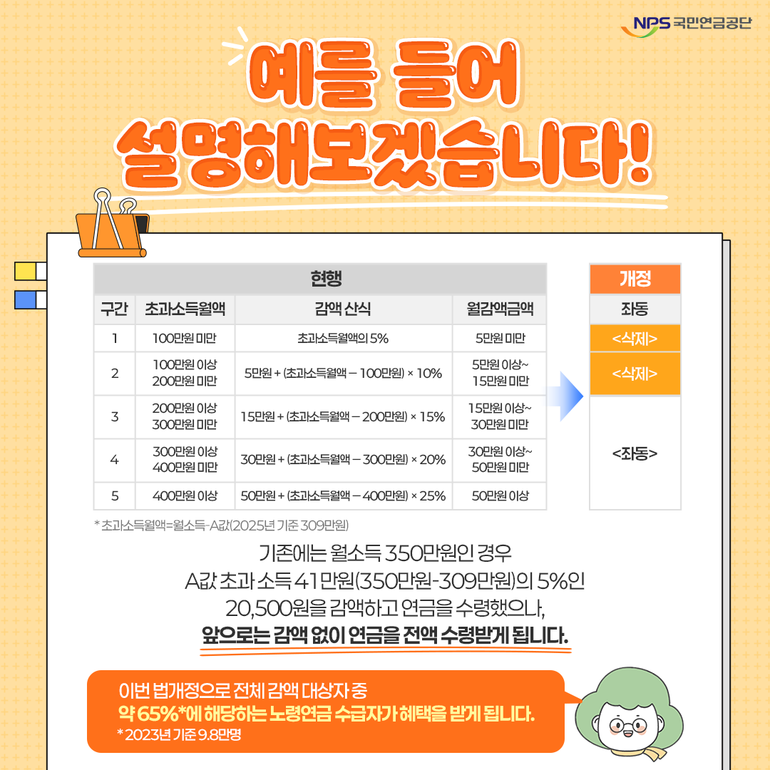 - 기존에는 같은 소득 수준에서도 월 5만 원~15만 원씩 연금이 깎였습니다.