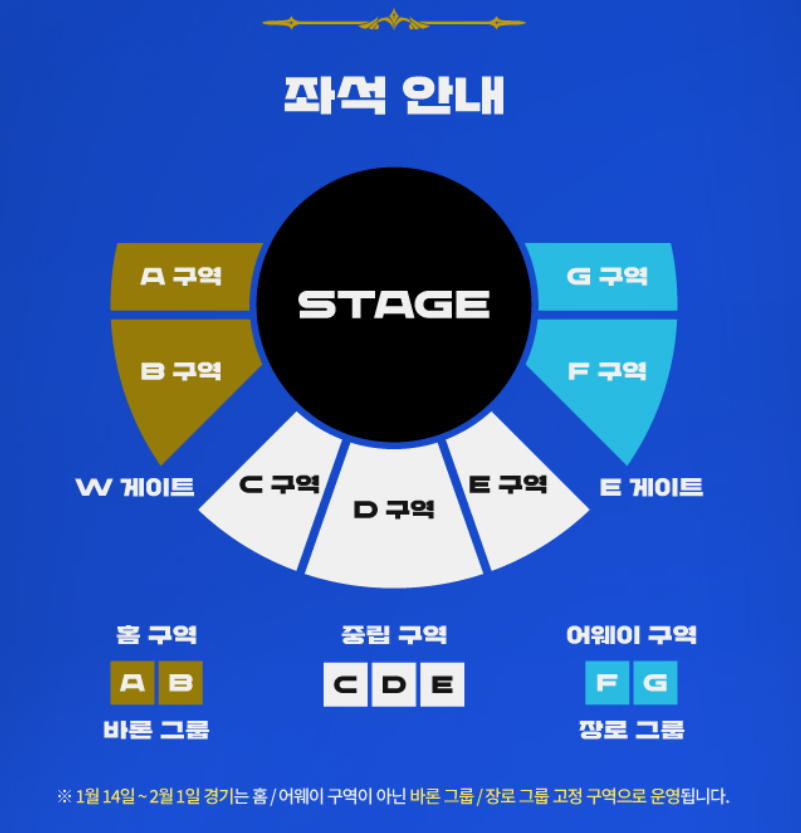 LCK컵 기간 동안 모든 팀은 두 개 그룹으로 나뉘며, 그룹별 응원 구역도 2월 1일까지 고정 운영됩니다.